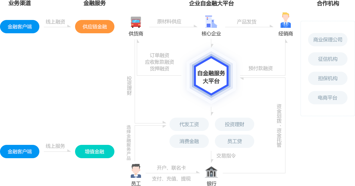 面向企業員工提供資金歸集、 代發工資、充值、提現、訂單支付、 投資理財、員工貸服務